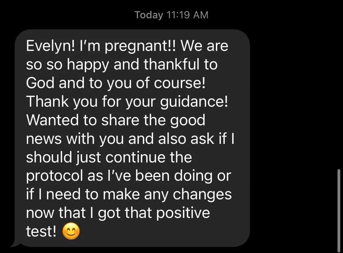 After that, we stepped away from fertility treatments and tried to just focus on my health the best way I knew how. Fertility treatments were frustrating to me because I didn't even get the chance to try naturally since I was either on medication for IVF or on birth control. We decided it wasn't for me. I finished my medical training and finally got the break that I needed so much. Even still, no baby. I was on TikTok and I came across Evelyn's video of a client who had gotten pregnant with her help. At that point I felt like I knew some of the research (more protein, more fiber, this supplement, that supplement, low impact exercise) but I had no guidance and I felt so lost. Even as a medical professional, I had just seen western medicine fail me and I knew there had to be another way. I decided to reach out to Evelyn and I'm so glad I did!